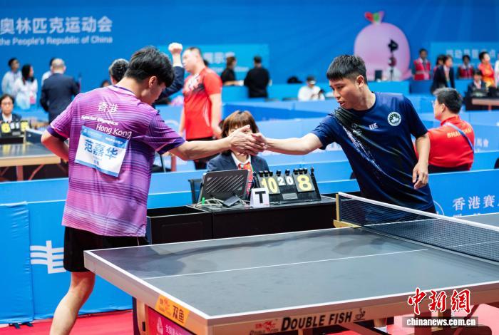图为喷鼻港队选脚范嘉华(左)战澳门队选脚林其臻(左)正在男单角逐后握脚请安。记者 侯宇 摄