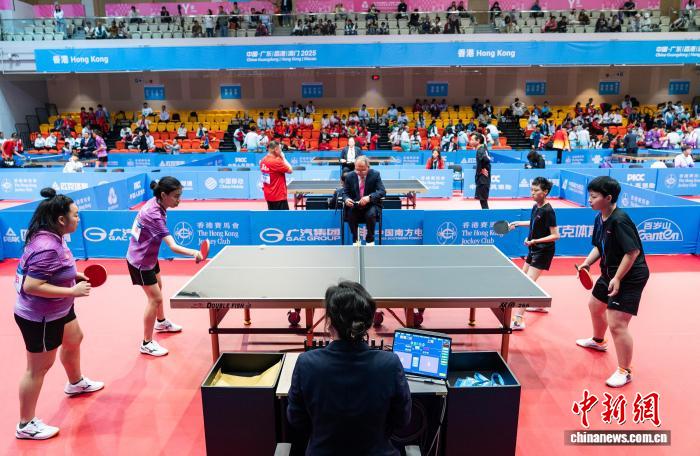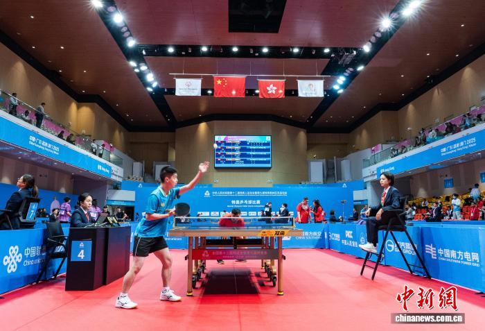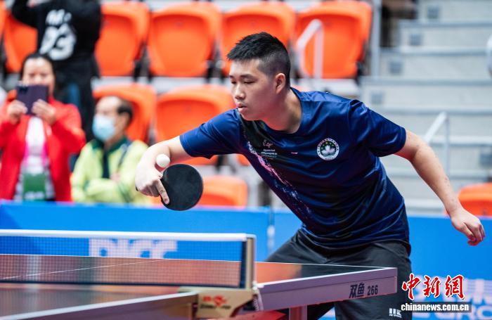 图为喷鼻港队选脚范嘉华(左)战澳门队选脚林其臻(左)正在男单角逐中。记者 侯宇 摄