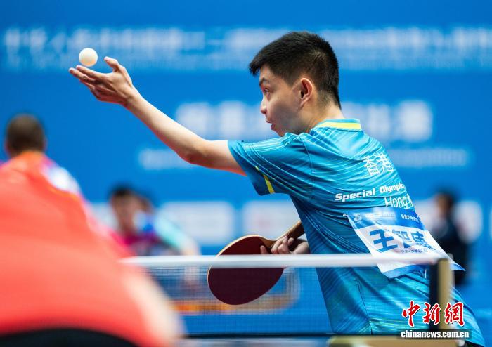 图为喷鼻港队选脚王智康正在男单角逐中收球。记者 侯宇 摄